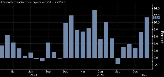 日本2月份出口加速增长,显示企业在一系列美国关税措施出台之前增加了订单。