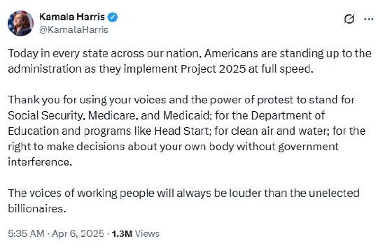 4月6日,美国前副总统民主党人卡玛拉·哈里斯在社交平台X发文表示:“如今,在我们国家的各个州,当政府全力推进 ‘2025项目’ 之时,美国民众都在勇敢地反抗这一举措。”