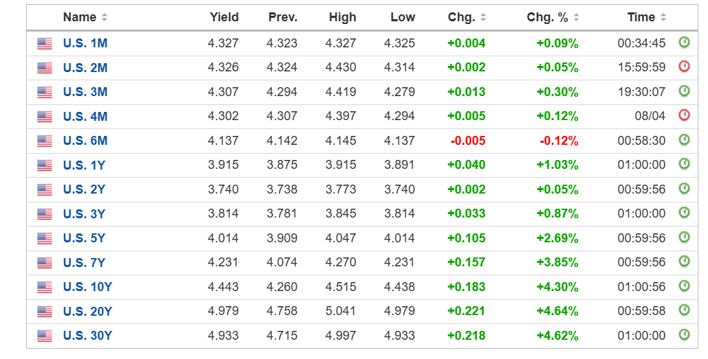 美国国债连续第三天大幅杀跌,美国10年期国债收益率今天一度逼近4.5%。其他期限国债收益率亦大幅飙升。这意味着,美国国债正在被抛弃。