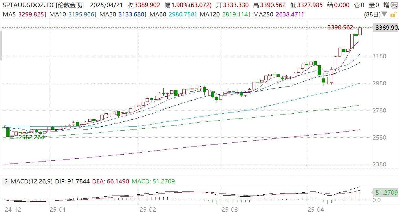 格隆汇4月21日|美元走弱,一度跌至98.1640,创2022年3月以来新低。美元走弱刺激黄金继续走强,伦敦金现今日盘中涨近2%,站上3390美元/盎司,再创历史新高。伦敦金现年内累涨超29%。