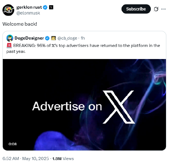 社交媒体X平台网友发帖称,过去一年,X的头部广告客户已回归了96%。马斯克转发该推文,称“欢迎回来 ”。