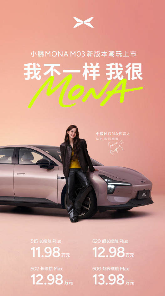 凤凰网科技讯(作者/于雷)5月28日,小鹏汽车今晚正式发布MONA M03车系的旗舰车型Max版,新车共推出两个续航版本,502长续航Max版售价12.98万元,600超长续航Max版售价13.98万元。同时,欧阳娜娜作为MONA M03代言人亮相发布会现场。