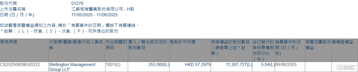 恒瑞医药(01276.HK)获Wellington Management Group LLP增持25.3万股