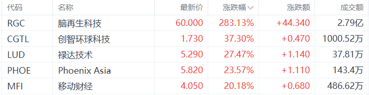 美股异动丨脑再生科技暴涨283.13%,为涨幅最大的中概股