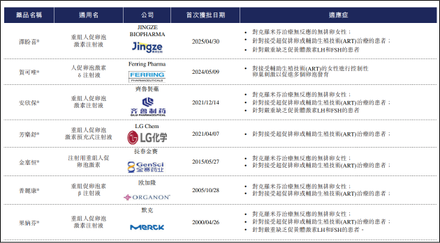 从产品角度看,景泽生物所有处于研发后期的管线均为仿制药,其中首款商业化产品重组人促卵泡激素冻干粉针剂型产品JZB30为辅助生殖周期中的促排卵药物,对标原研药为全球促排卵市场占有率最高的进口产品粉针剂型果纳芬®,该产品的NDA申请已于2025年4月获得国家药监局批准。