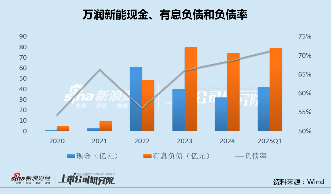 今年一季度末,万润新能负债率升至71.16%,再度刷新历史新高。继续推进50亿规模的锂电、钠电、固态电池及氢储能等投资项目,对公司而言,无疑是一个沉重负担。