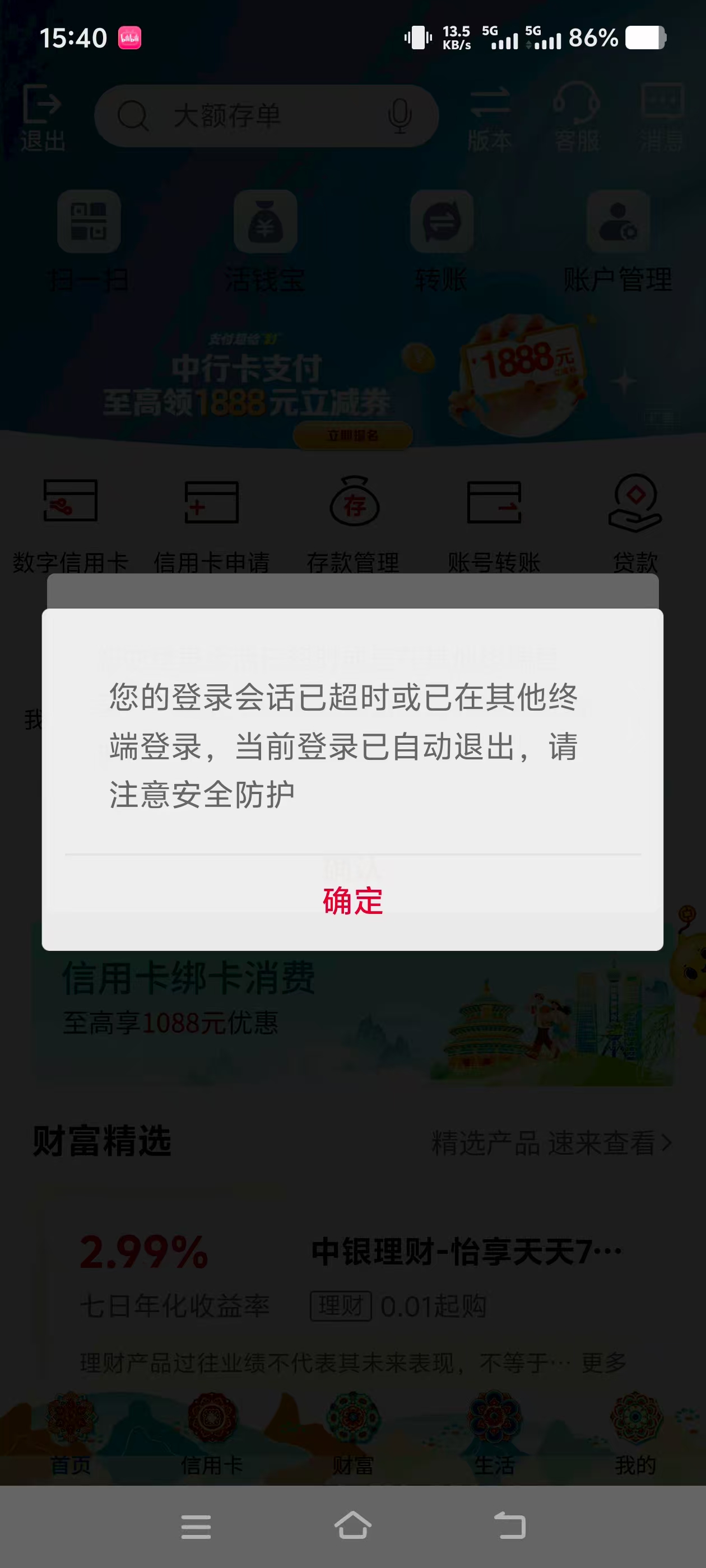 7月25日金融一线消息,金融一线注意到,中国银行APP出现登录异常情况。采用指纹登录弹窗提示称:“您的登录会话已超时或已在其他终端登录,当前登录已自动退出,请注意安全防护。”采用短信验证码登录则会提示用户验证码超时。