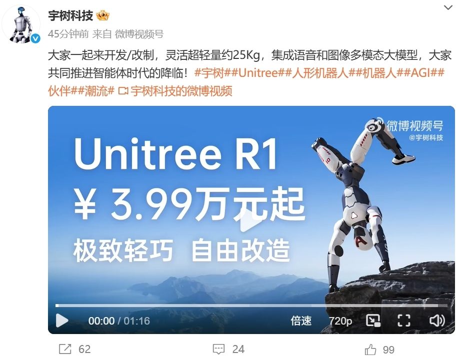 7月25日,宇树科技发布第三款人形机器人“UnitreeR1智能伙伴”,该机器人售价3.99万元起,支持开发/改制,灵活超轻量约25Kg,集成语音和图像多模态大模型。在视频中,R1展现了自己下坡、翻跟头、倒立等运动控制能力。