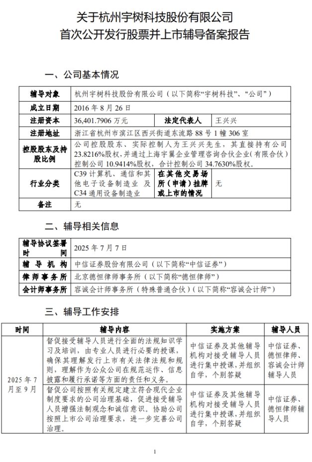 此前,中国证监会官网显示,宇树科技已开启上市辅导,由中信证券(600030)担任辅导机构。辅导备案报告显示,宇树科技控股股东、实际控制人为王兴兴,王兴兴直接持有公司23.8216%股权,并通过上海宇翼企业管理咨询合伙企业(有限合伙)控制公司10.9414%股权,合计控制公司34.7630%股权。