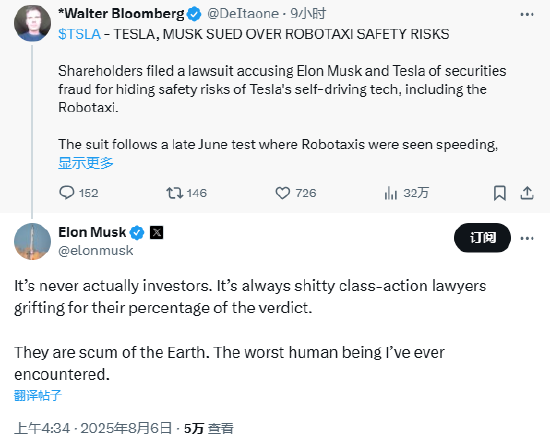 马斯克转发一条关于“特斯拉和马斯克因自动驾驶出租车安全风险被起诉”的贴文,贴文称“股东提起诉讼,指控埃隆·马斯克和特斯拉隐瞒了包括Robotaxi在内的特斯拉自动驾驶技术的安全风险,犯有证券欺诈罪。投资者声称特斯拉夸大了其技术能力,误导了公众,并抬高了其股价。”