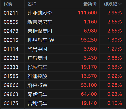 港股汽车股集体上涨,其中,比亚迪股份涨3%领衔,理想汽车、华晨中国涨1.3%,广汽集团、零跑汽车、长城汽车、蔚来汽车、吉利汽车均上涨。