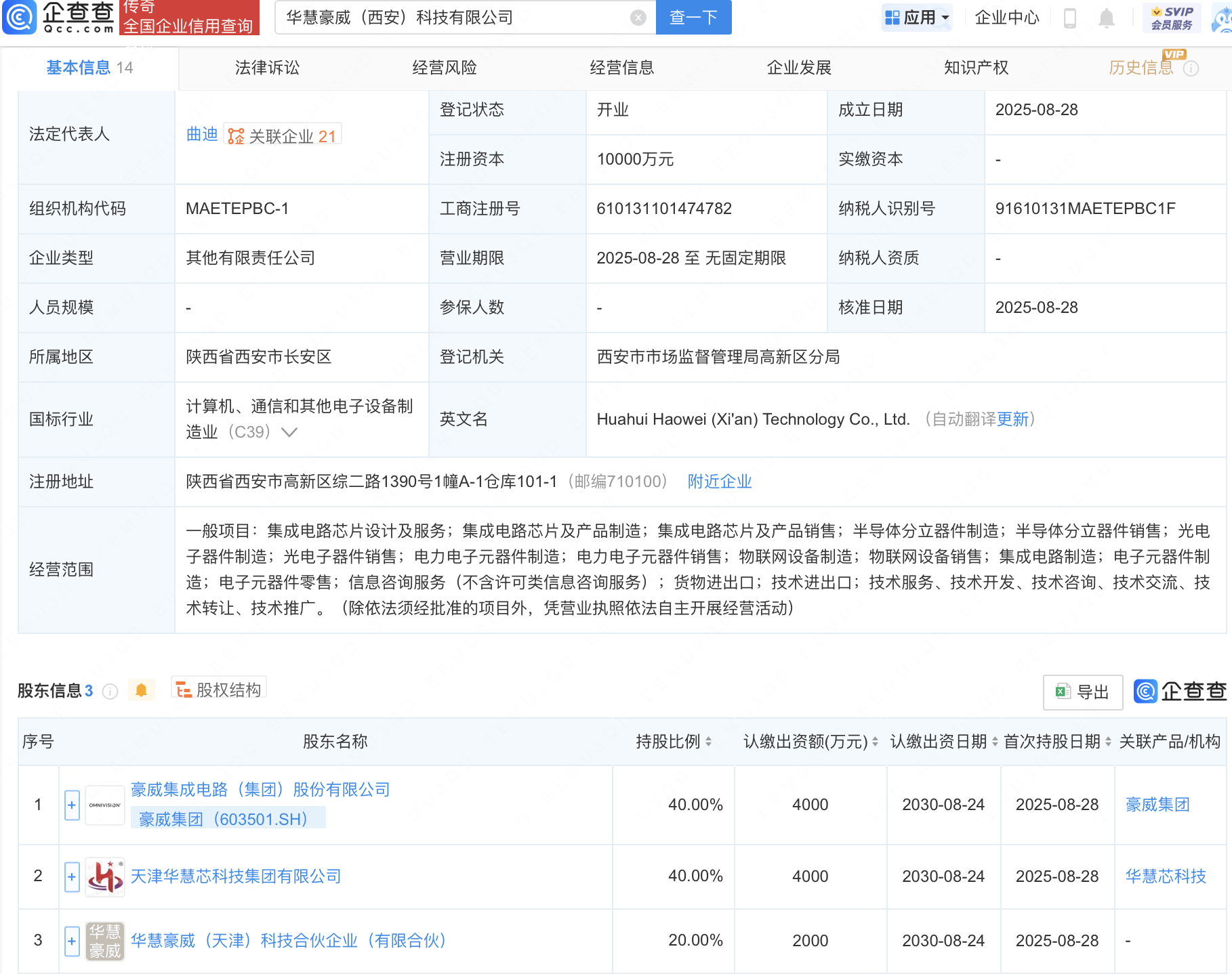 企查查APP显示,近日,华慧豪威(西安)科技有限公司成立,注册资本1亿元,经营范围包含:集成电路芯片及产品销售;半导体分立器件制造;半导体分立器件销售;物联网设备制造;物联网设备销售等。企查查股权穿透显示,该公司由豪威集团(603501)等共同持股。