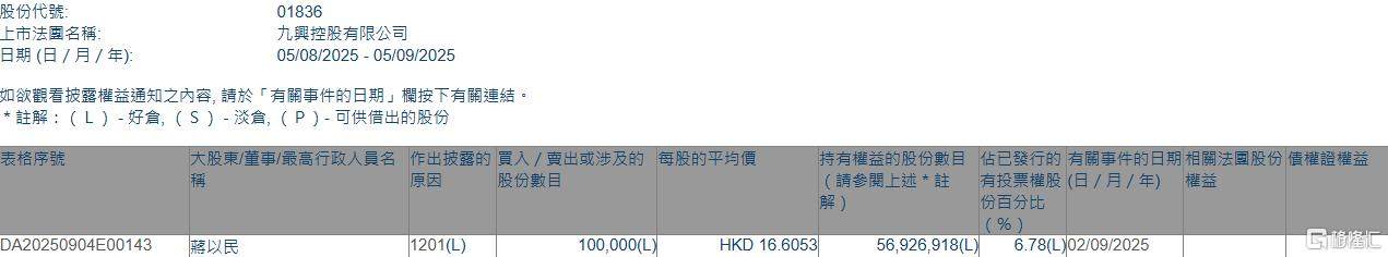 格隆汇9月5日丨根据联交所最新权益披露资料显示,2025年9月2日,九兴控股(01836.HK)遭执行董事蒋以民在场内以每股均价16.6053港元减持10万股,涉资约166.053万港元。