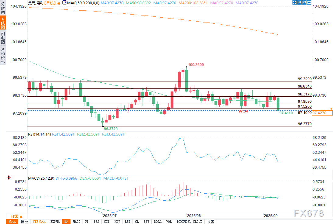 汇通财经APP讯――周五(9月5日),美元指数承受下行压力,明确跌破50日均线98.000,该均线目前已成为新的阻力位。同时,美元指数还跌破了97.859至98.317区间的关键斐波那契回撤位,进一步强化了看跌情绪。周五的下跌使美元指数跌破97.536的小幅低点,为测试7月24日97.109的低点打开空间,而7月1日96.377的低点也再度成为市场关注焦点。