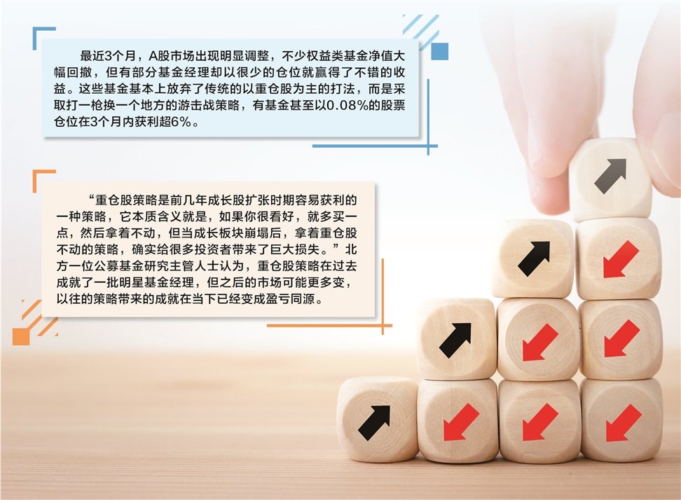 最近3个月,A股市场出现明显调整,不少权益类基金净值大幅回撤,但有部分基金经理却以很少的仓位就赢得了不错的收益。这些基金基本上放弃了传统的以重仓股为主的打法,而是采取打一枪换一个地方的游击战策略,有基金甚至以0.08%的股票仓位在3个月内获利超6%。