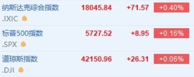 美股三大指数集体高开,纳指涨0.4%,标普500指数涨0.16%,道指涨0.06%。
