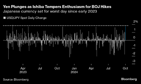 日元暴跌,此前日本新任首相石破茂称经济还没有为进一步加息做好准备,导致汇市震荡。