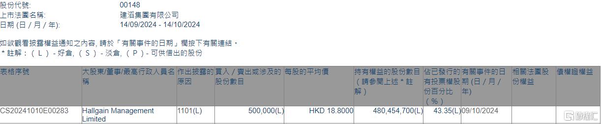 格隆汇10月14日丨根据联交所最新权益披露资料显示,2024年10月9日,建滔集团(00148.HK)获Hallgain Management Limited在场内以每股均价18.80港元增持50万股,涉资约940万港元。