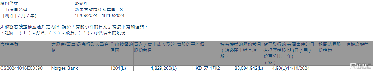 新东方-S(09901.HK)遭Norges Bank减持182.92万股