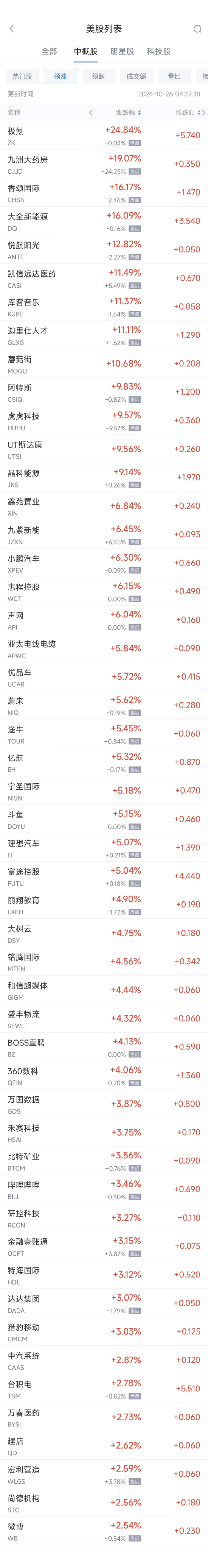 上涨股当中(按市值降序排列),台积电涨2.78%,阿里巴巴涨1.10%,拼多多涨0.90%,京东涨1.45%,网易涨1.08%,百度涨0.35%,理想汽车涨5.07%,中华电信涨0.16%,贝壳涨1.71%,日月光半导体涨1.98%,腾讯音乐涨0.52%,联电涨0.52%,富途控股涨5.04%,华住酒店集团涨0.90%,蔚来涨5.62%,小鹏汽车涨6.30%,哔哩哔哩涨3.46%,唯品会涨0.28%,WSP控股涨0.68%,极氪涨24.84%,BOSS直聘涨4.13%,360数科涨4.06%,万国数据涨3.87%。