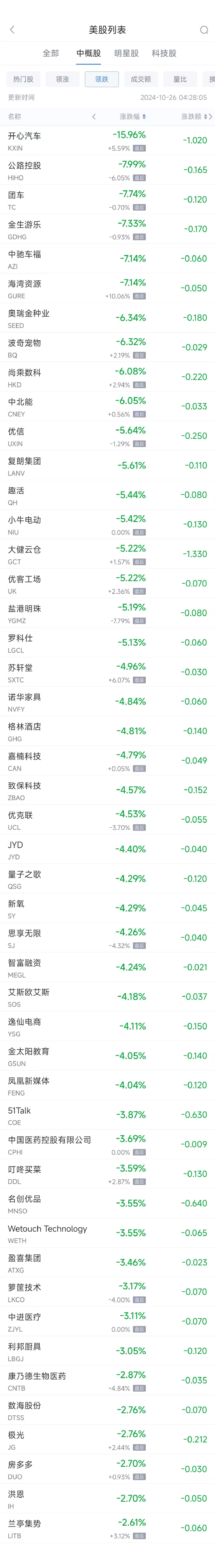 下跌股当中(按市值降序排列),携程跌0.34%,百济神州跌0.63%,中通跌1.58%,新东方跌0.69%,满帮跌0.44%,名创优品跌3.55%,亚朵集团跌0.76%。