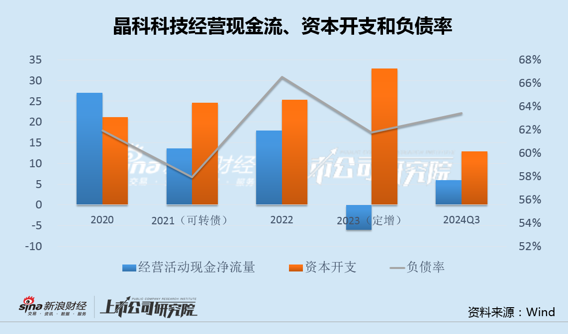 此外,晶科科技现金流长期入不敷出,上市4年多直接融资高达百亿,然而除2021年和2023年分别通过可转债和定增得以“补血”外,其余年份负债率都在上升,也就是说“融资停、负债升”,募投项目也大量变更和延迟。