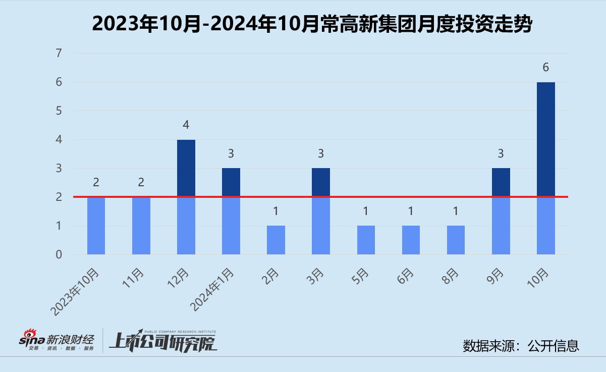统计区间内,常高新集团公开披露的股权投资事件共6起,较2023年10月提升200%,与9月相比翻番。往期数据显示,2023年第三季度至2024年第三季度,常高新集团的投资事件数稳定在每月5起以内,且平均季度投资频率呈下降趋势,直至本月才有所恢复。
