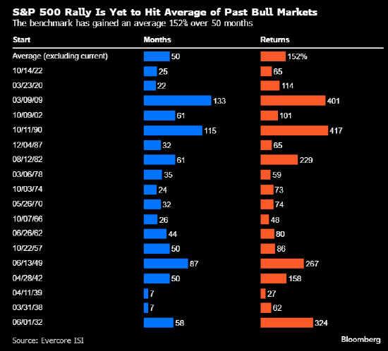 Emanuel团队的研究显示,过去100年牛市期间该基准指数50个月的平均涨幅为152%。在本轮行情中,标普指数自2022年10月触底以来反弹了65%,其中大部分行情来自科技权重股的推动。
