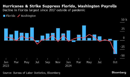 受两次飓风和波音公司大罢工影响,佛罗里达州和华盛顿州上月就业人数下降,进一步证明全国招聘数据的大幅放缓可能是暂时性的。
