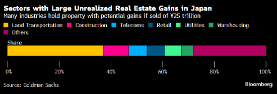 高盛估计,逾250家主营业务不是房地产的日本公司可能至少有25万亿日元的未实现收益。持有规模最大的一些公司来自铁路、建筑和公用事业行业。