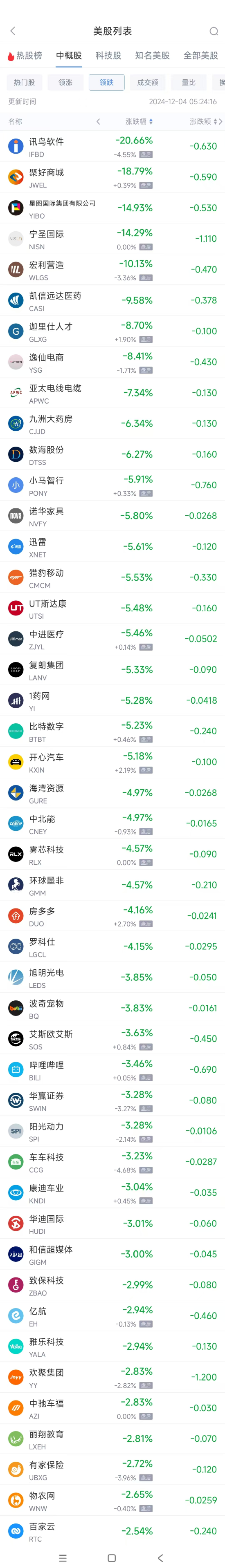 领跌中概股列表: