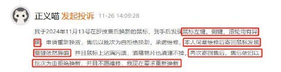 11月黑猫投诉企业红黑榜:新购罗技鼠标异响维修无果拒绝换新
