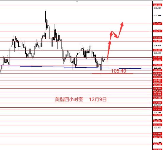 12月9日,美指上周区间震荡,最低十环扫损后再向上反弹,周图收小阳柱。从图形来看,虽然上周被扫损,但框架思路仍可延用,美指继续向上二次探顶的概率相对较大些,下方继续关注105.40区域强支撑,以上向上反弹,二次探顶完再次给出向下信号后方可波段性做空。激进者可继续短线做多,操作策略:105.90附近作多,止损105.30,目标看向106.40和106.80,再看向107.20和107.50区域。控制仓量,严格止损。