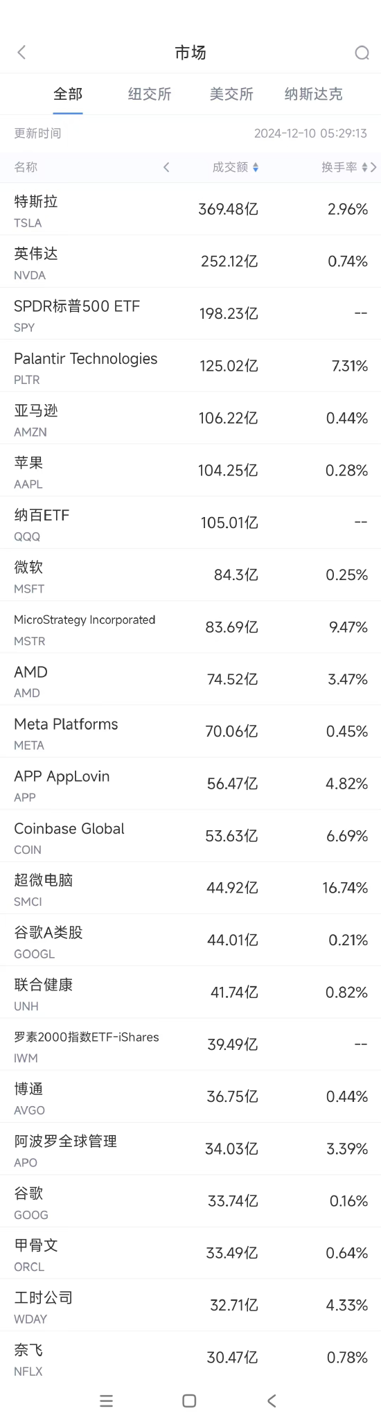 第4名亚马逊收跌0.41%,成交106.22亿美元。数据显示,沃尔玛、亚马逊、快速增长的电商平台Shein以及Temu在“黑色星期五”和“网络星期一”的销售额均创下历史新高,这表明它们可能会以比陷入困境的塔吉特和百思买更强劲的表现结束假日季。