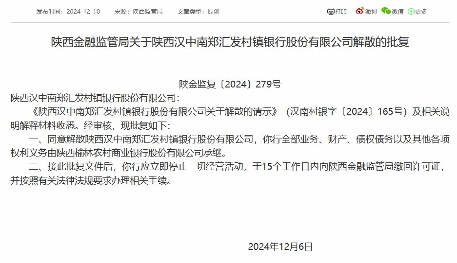 12月10日金融一线消息,陕西金融监管局今日发布两则批文指出,同意解散陕西咸阳渭城汇发村镇银行、陕西汉中南郑汇发村镇银行,两家村镇银行全部业务、财产、债权债务以及其他各项权利义务由陕西榆林农村商业银行承继。