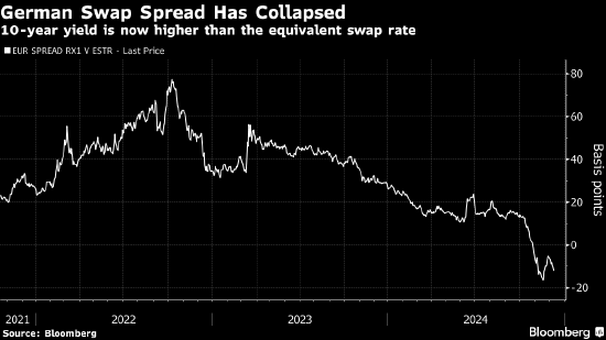 由于投资者对庞大的债务和赤字膨胀感到担忧,欧元区和日本的国债收益率最近超过了可比的互换利率。这导致所谓的互换利差变成负值,由于国债通常被视为比利率互换更安全的投资,因此互换利差进入负值区间很不寻常。