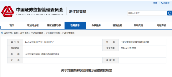 对此,浙江证监局决定,对董杰采取出具警示函的监督管理措施,并记入证券期货市场诚信档案。同时要求其本人加强法律法规学习,切实提升规范从业意识,恪守执业准则,杜绝此类违规事项再次发生。