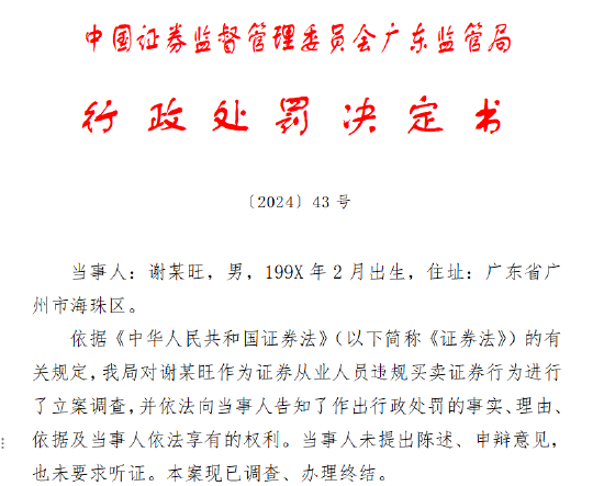 12月4日,广东证监局披露了一则行政处罚决定书,银河证券从业人员谢某旺因违规炒股,被处以5万元罚款。