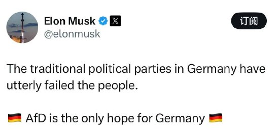 马斯克在社交网络平台X上写道:“德国传统政党彻底辜负了他们的人民,选择党是德国唯一的希望。”