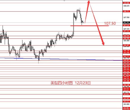 12月23日,上周美指正如预期继续向上拉涨,目标位108.30到位。从图形来看,这波涨幅也差不多了,后市建议谨慎做多,空间不大了,从长线角度来讲,建议以高空为主,前期的波段大框架思路仍可延用,上方关注108.30和109.50强阻力,是长线波段转折点区域,后市长线看空美指。短线交易者目前可操作性不大,加上本周圣诞节休市,所以大概率以震荡行情为主。