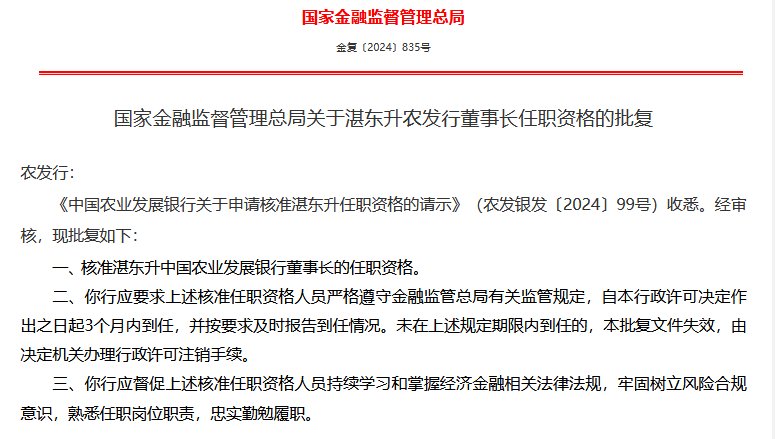 12月24日金融一线消息,国家金融监督管理总局日前发布关于湛东升农发行董事长任职资格的批复,核准湛东升中国农业发展银行董事长的任职资格。