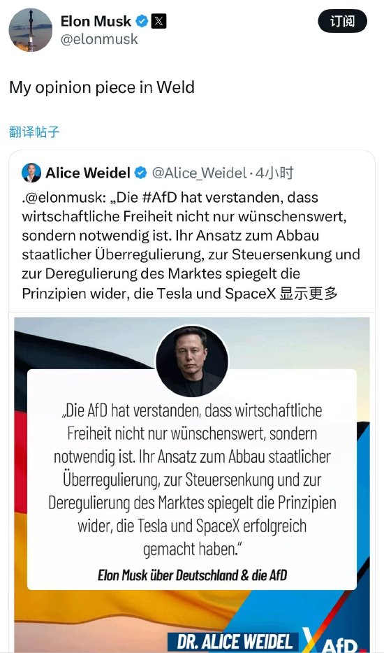马斯克德媒刊文再挺德国极右翼政党