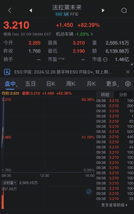 法拉第未来美股盘初拉涨,现涨超80%,发生停牌,上周累涨超51%,公司此前宣布完成新一轮3000万美元的融资,三个月内共获6000万美元融资。