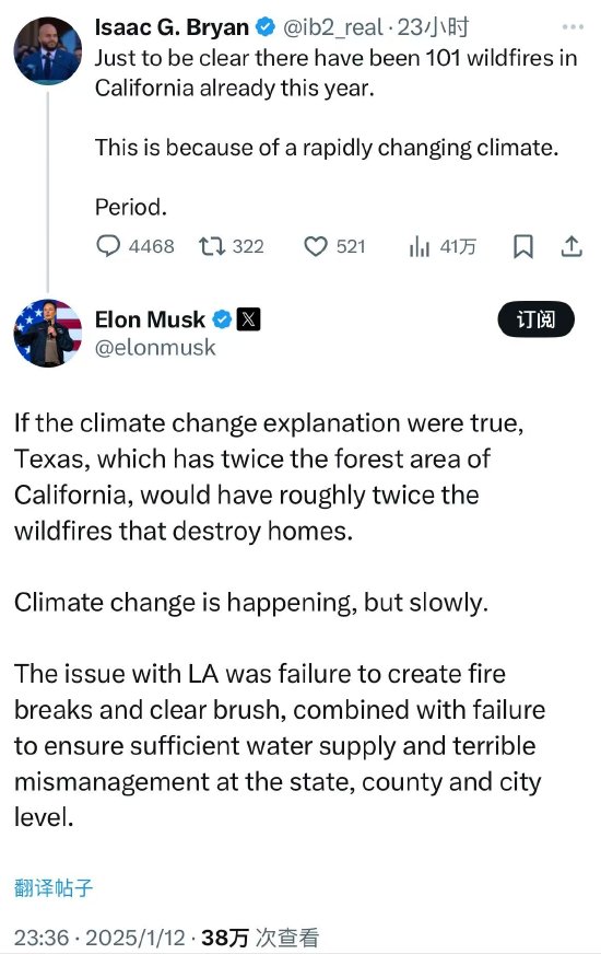 马斯克在评论一位用户发文称正是气候变化已经给加州带来了101起大火时在他的社媒X页面上写道:“如果(编注:大火)由气候变化引起的解释是对的,那么德克萨斯州的森林面积是加利福尼亚州的两倍,烧毁房屋的大火数量也应该是加州的大约两倍。”。