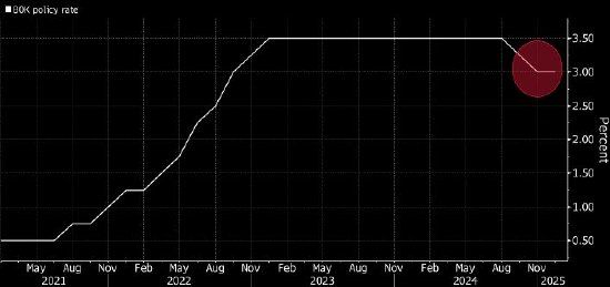 韩国央行过去两次会议已经下调了利率,最近一次降息一定程度上是预防行动,出于对特朗普重返白宫的担忧而提前对经济给予支撑。