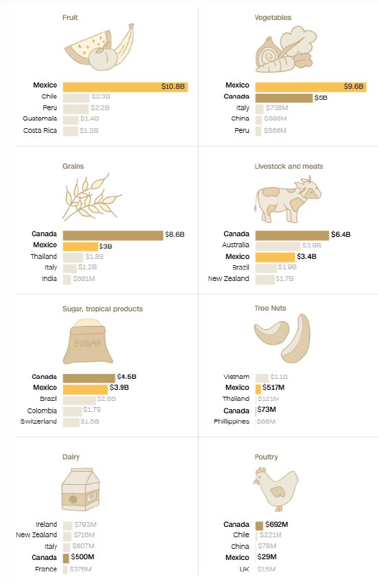 以下是去年按特定品类划分,向美国出口农产品的主要国家: