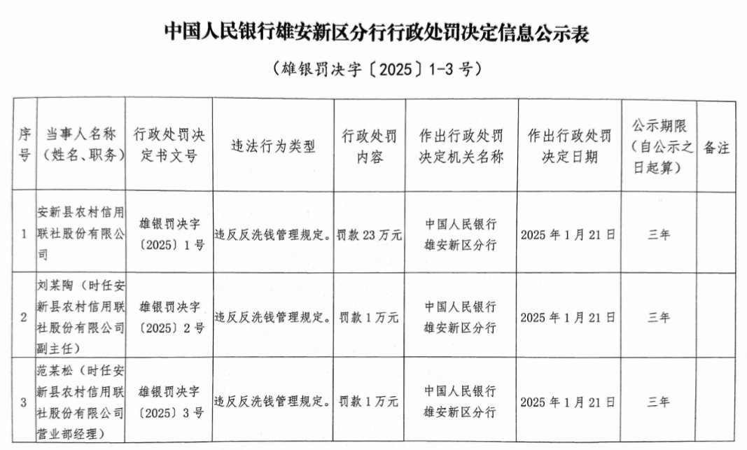 2月8日金融一线消息,中国人民银行雄安新区分行行政处罚决定信息公示表显示,安新县农村信用联社股份有限公司因违反反洗钱管理规定被罚款23万元。刘某陶(时任安新县农村信用联社股份有限公司副主任)、范某松(时任安新县农村信用联社股份有限公司营业部经理)二人分别被罚款1万元。