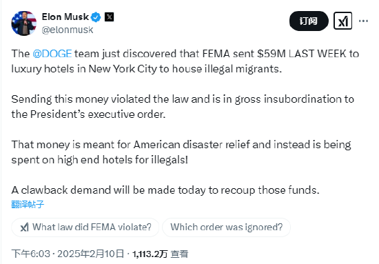 北京时间2月10日晚,马斯克在X发文称,美国“政府效率部”(DOGE)发现,联邦紧急事务管理署(FEMA)上周向纽约市的豪华酒店拨款5900万美元,用于安置非法移民,这笔钱违反了法律、严重违反了总统的行政命令。