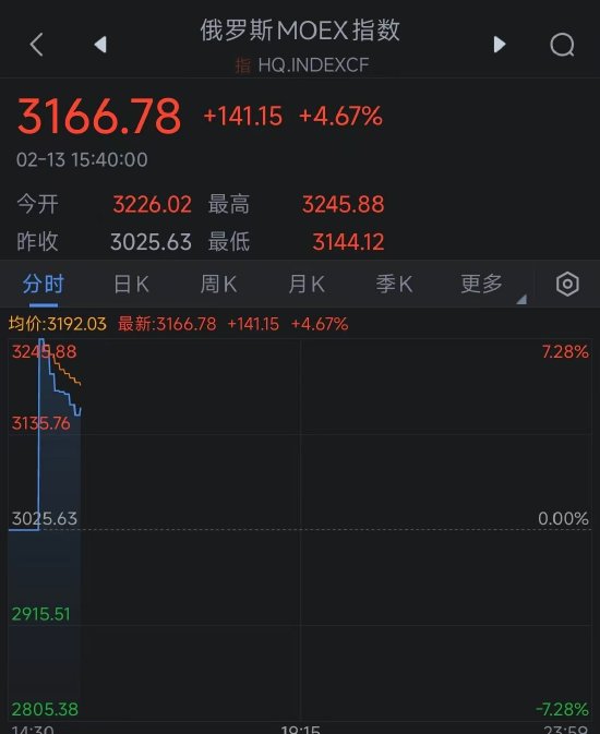 莫斯科证券交易所数据显示,受地缘政治预期影响,俄罗斯股市在早盘强劲上涨,MOEX指数一度涨逾7%。截至发稿,指数涨幅回落至4.7%,报3166.78点。周三晚上,俄罗斯总统普京和美国总统特朗普进行了近一个半小时的电话会谈。双方特别讨论了解决乌克兰局势、中东局势、伊朗核计划和双边经济关系等问题。两国元首同意继续保持个人接触,包括组织一次个人会晤。受此影响,该指数在夜盘交易中一度飙升至3200点以上。