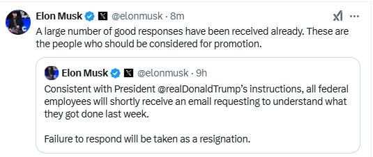 23日,马斯克在X平台转发了“联邦雇员需要‘交周报’否则视为辞职”的推文,并表示:“已经收到了很多不错的回复,应该提拔这些人。”
